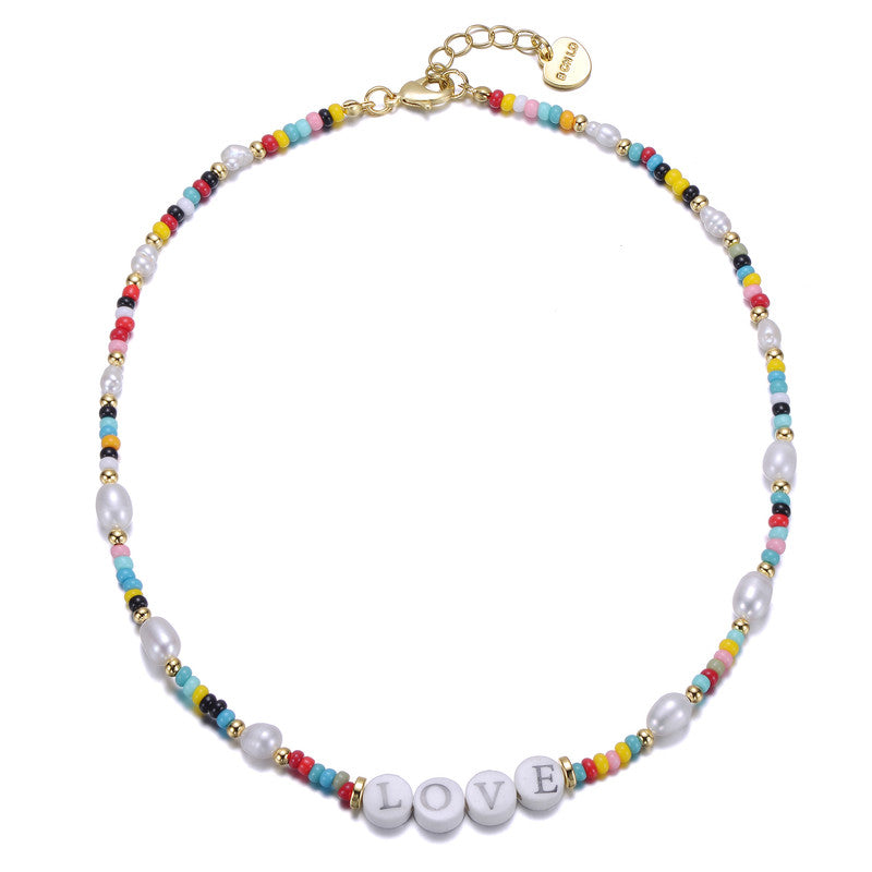 Add some sparkle and color to your outfit with this beautiful necklace. It features 14k yellow gold plated beads in various hues, freshwater pearls for a touch of elegance, and a love tag in a circular charm for a sweet message. The necklace has a lobster clasp for easy wearing and adjusting.