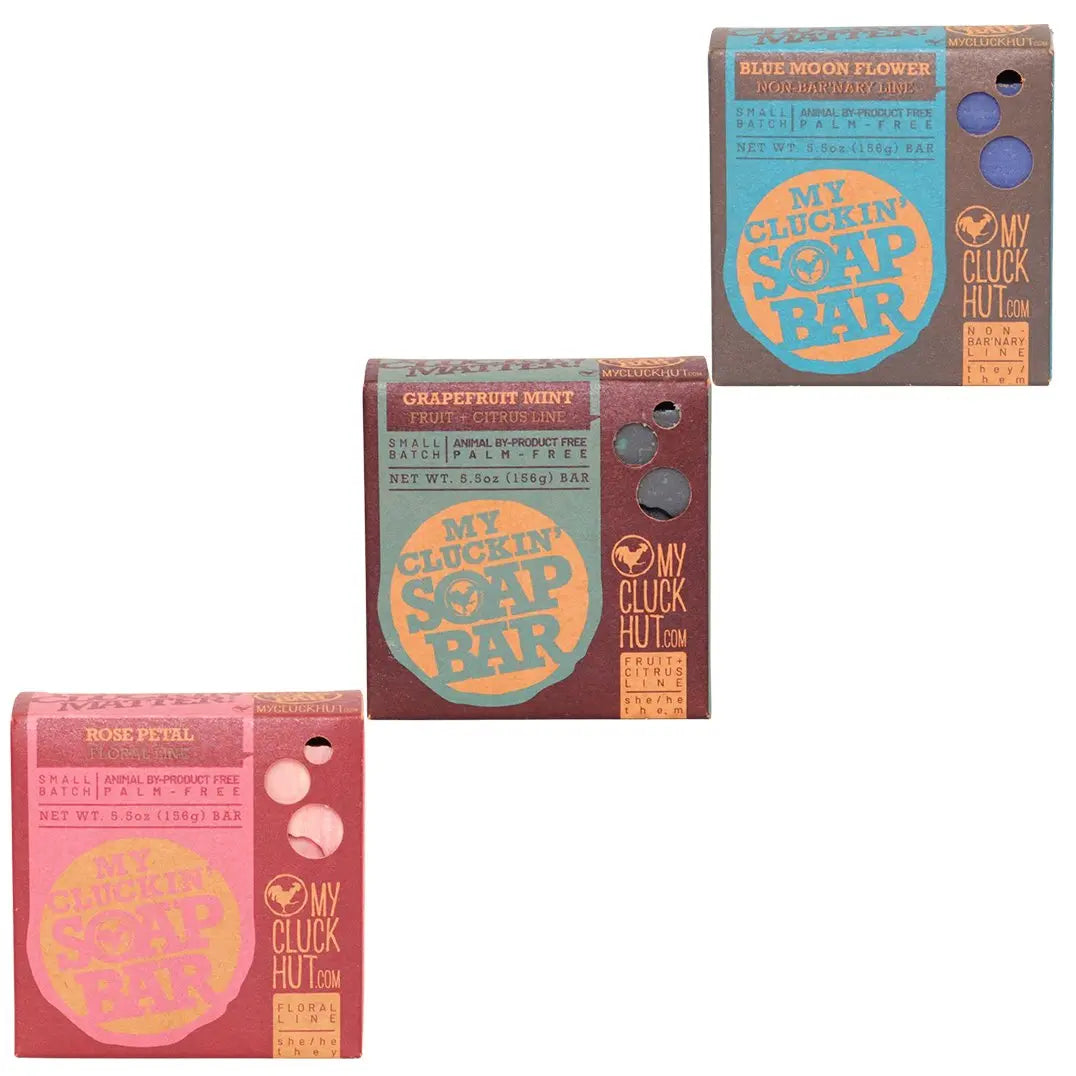 Why a Cluckin’ Bundle? Besides saving 10%, which is awesome, you get to cycle through 3 of our best selling soap bars at your leisure!