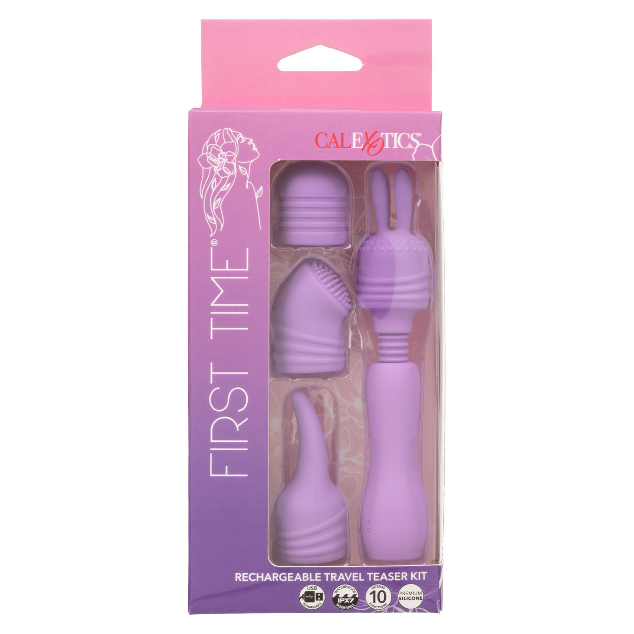 Set off on a journey of discovery with the First Time Rechargeable Travel Teaser Kit, a versatile kit designed to tantalize and tease wherever you roam. This compact massager comes with a flexible head and four interchangeable attachments, each crafted to target different desires, offering a personalized touch to your pleasure.