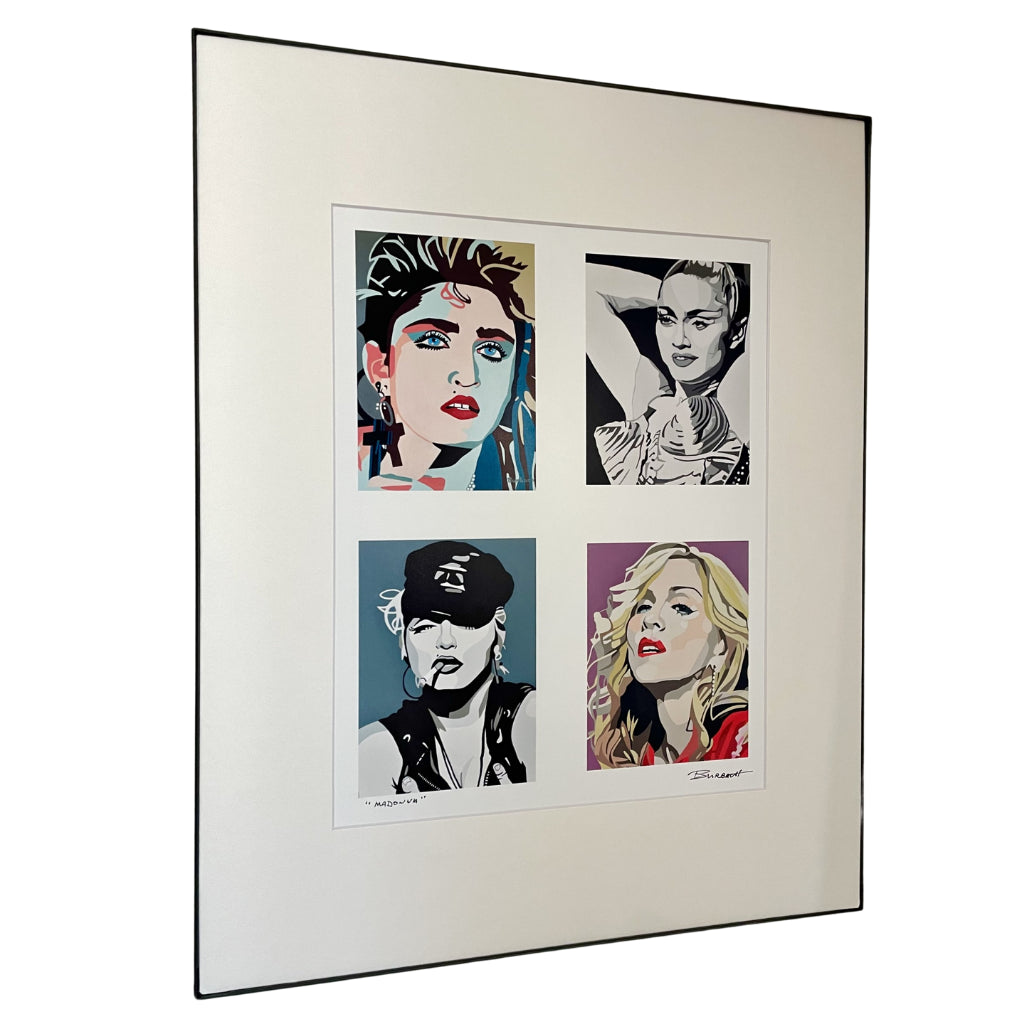 Four image collage of all of Chris Burbach's iconic Madonna prints. Originally acrylic on canvas, this product is a framed reprint. Some cropping occurs during printing but does not affect the look or quality of the print.