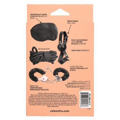 Unleash your inner adventurer with the Pleasure Kits Explorer Collection, a tantalizing set designed to take your sensory play to exhilarating new heights. This collection is a treasure trove for the curious, featuring a breathable ball gag with a fully adjustable buckle, an eye mask that stretches to fit, removable faux fur cuffs, and 16.5 feet of rope. Whether you're a seasoned enthusiast or new to the game, this kit is designed to unlock new realms of pleasure.