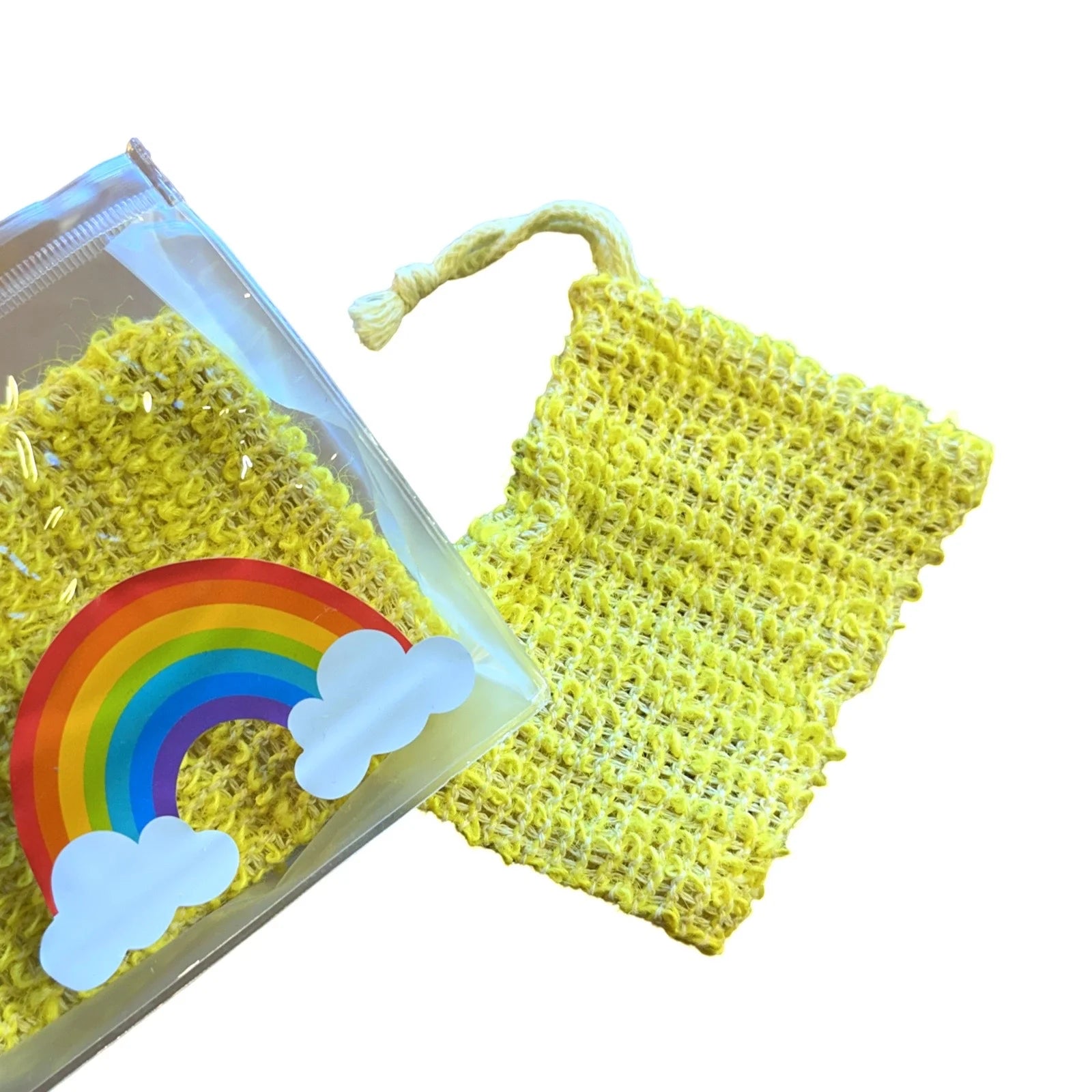 1 x Soap scents with fresh lemongrass / verbena, 1 x soap unscented with parts of rainbow colors, 1 x Lip balm cherry, and 1 x Yellow Soap saver scrub pouch.