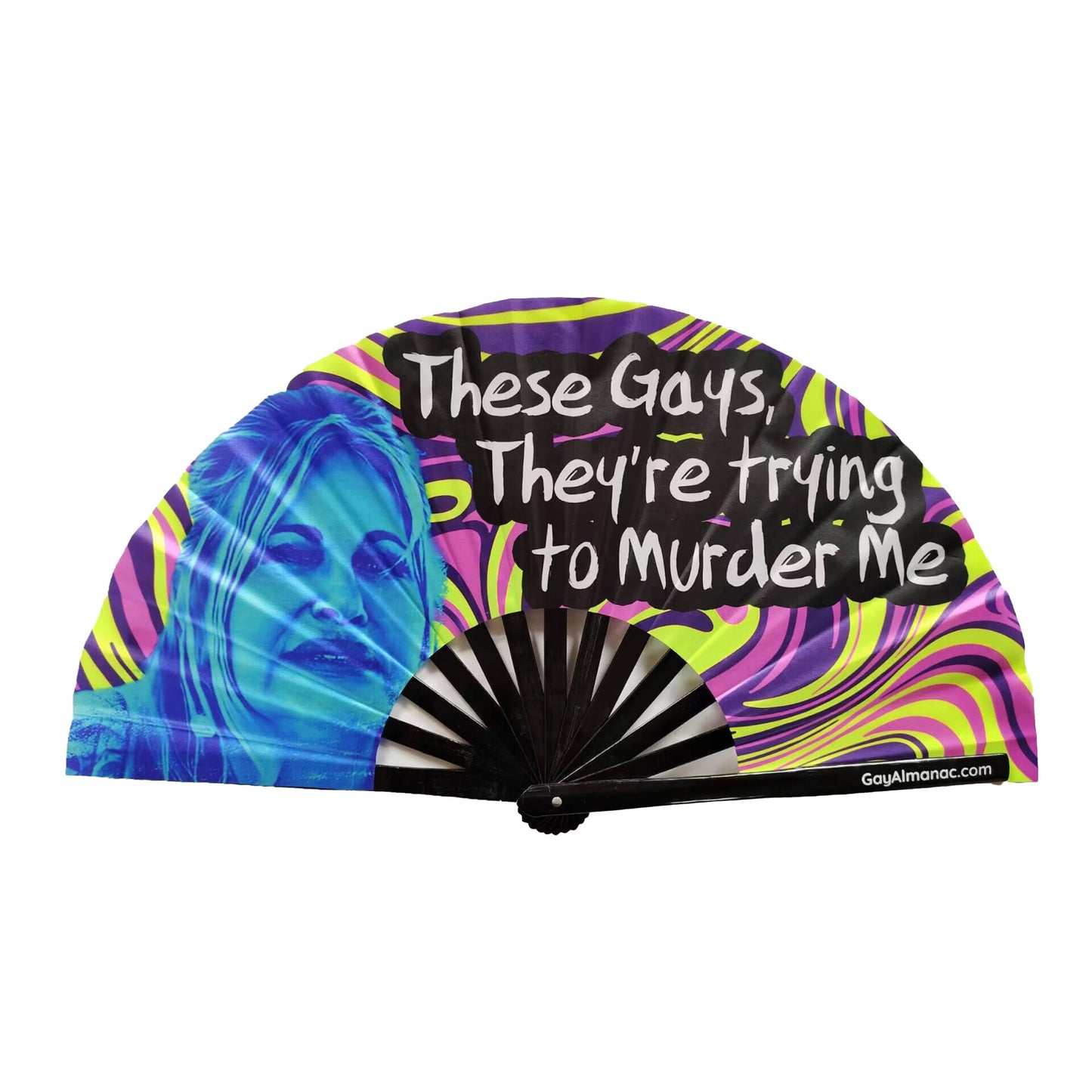Stay cool with the These Gays, They're Trying To Murder Me Fan! This fun accessory is perfect for those hot days at music festivals or parties. Pair it with our stylish Zebra Print Shorts or Rainbow Reflective outfits.